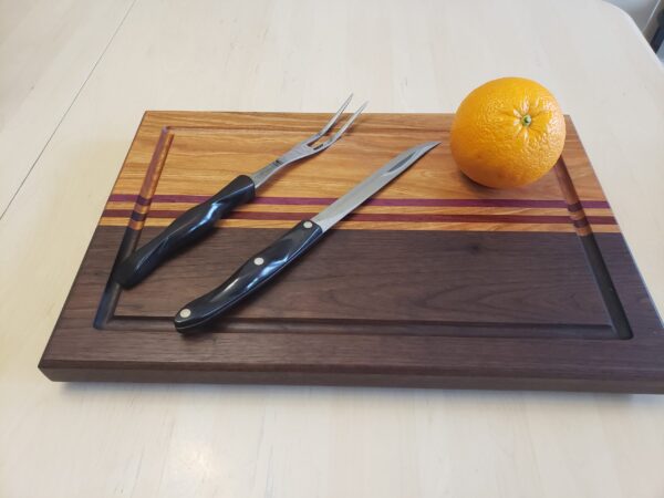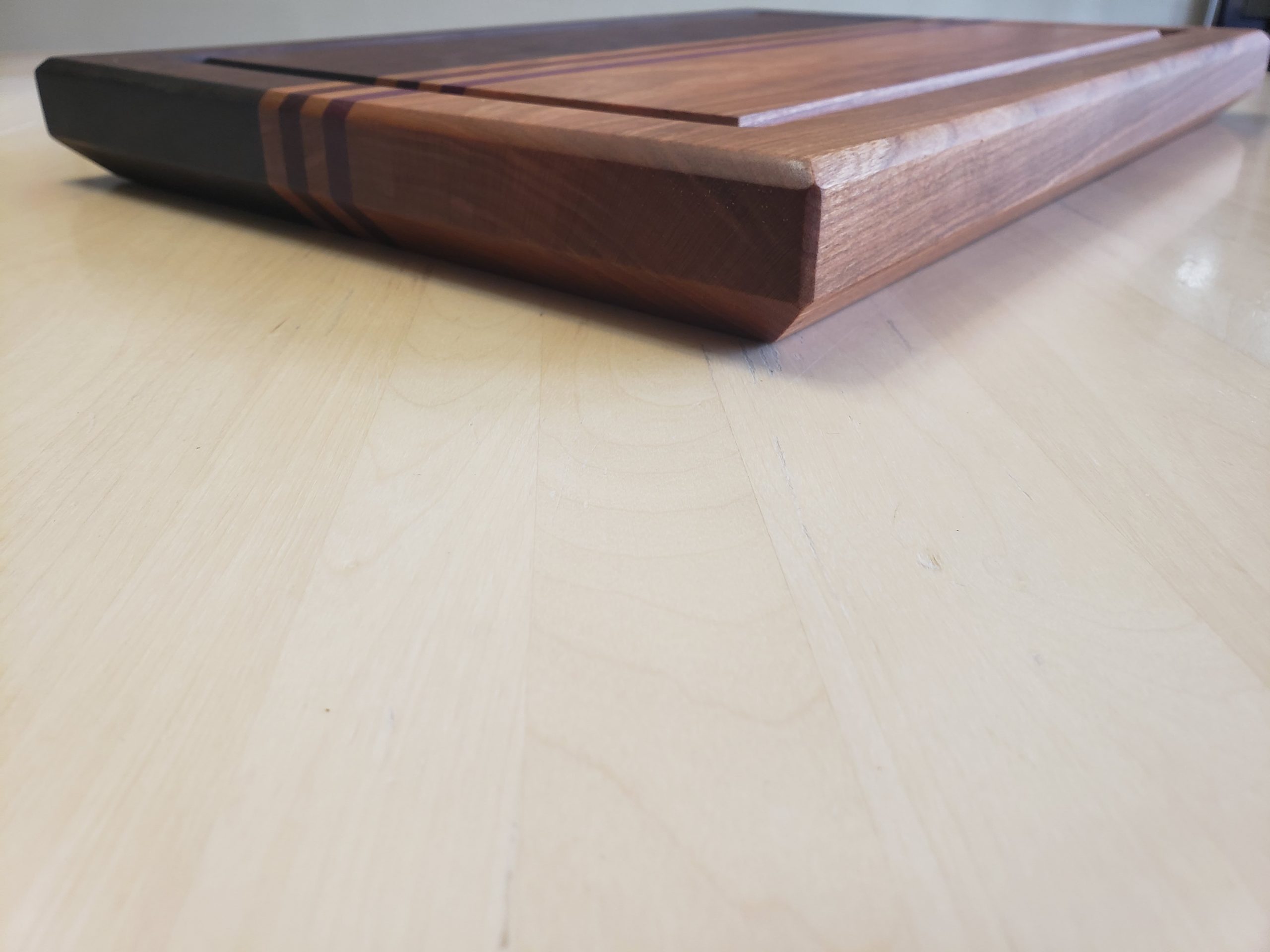 Hardwood edge grain cutting board made from Ontario grown Walnut & Cherry with Purple Heart & Padauk Stripes.